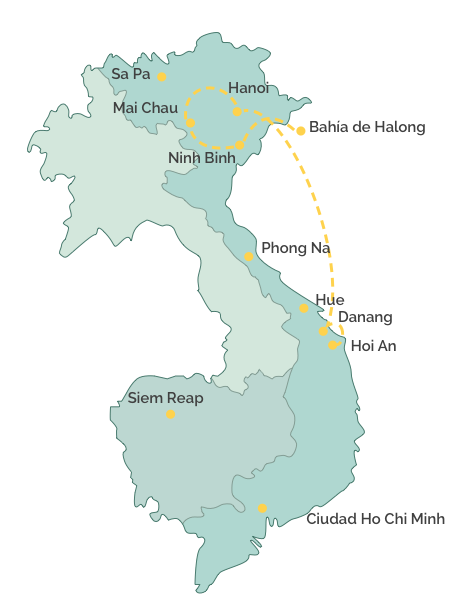 Un recorrido que combina lo esencial del norte de Vietnam con la dulzura costera del centro, un viaje de paisajes, sabores y alma.